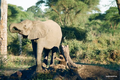...walking into this open air bar~lounge and peering out into the sunlight, only metres away, and seeing Elephants! See them out by the watering hole? and if you squint and turn your eyes on to the patch of grass where the chairs are, you will see where Karen, Val and I stood and called you that night in May...