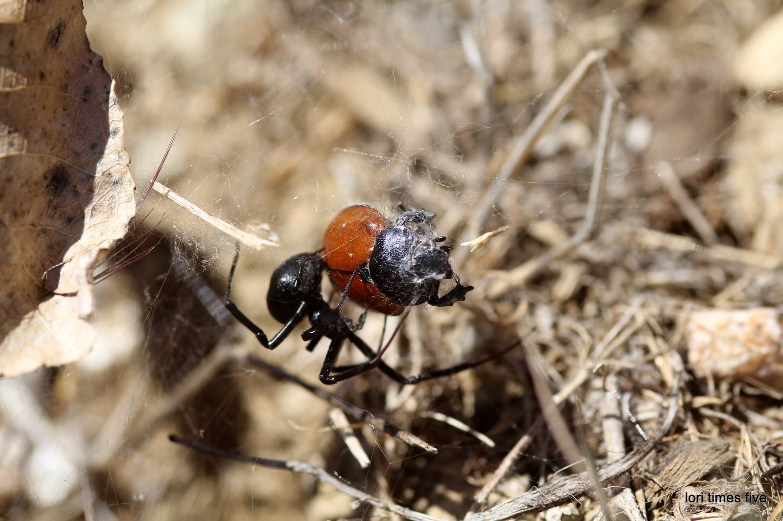 i found this, chuck photographed it. a huge black widow covered it's poor victim. in minutes she had the scarab beetle wrapped, swirling it around in it's web, and finally when it was no longer recognizable, she pulled it down into her lair.